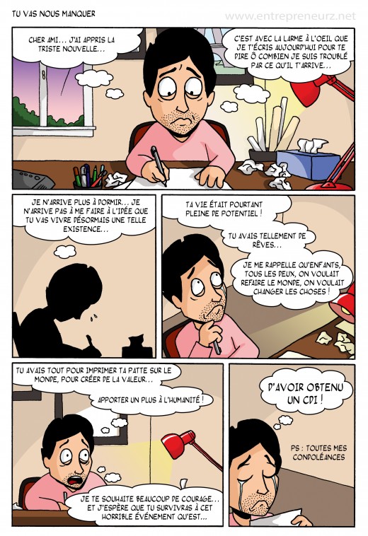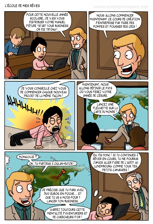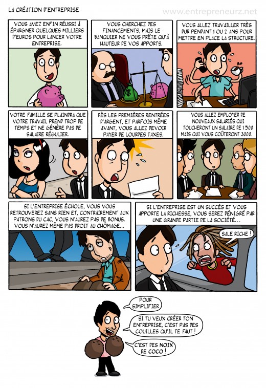 Rédigée et dessinée avec beaucoup d'humour et d'auto-dérision, la BD casse toutes les idées reçues sur les entrepreneurs: mode de vie, quotidien, argent et regard des autres. Clément met un point d'honneur à se moquer gentillement de ces camarades qui "osent" avoir un travail de salarié confortable. Par exemple, les métiers de l'audit et du consulting sont assez moqués dans cette BD, pour le plus grand bonheur des entrepreneurs, qui vont se retrouver à (presque) toutes les pages.
