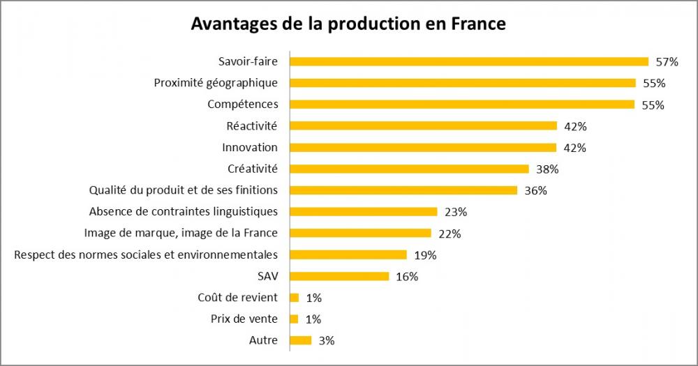 Concernant les avantages pour eux à produire en France, ils mettent en avant le savoir faire (57%), la proximité géographique (55%) et les compétences (55%). En revanche, coût de revient et normes sont largement estimés comme négatifs.