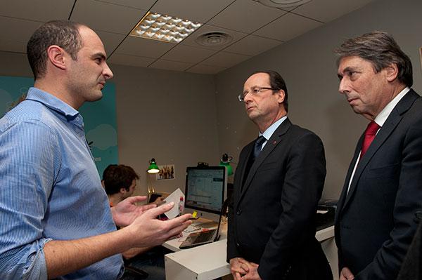 "C'est à 16h45, avant la cérémonie des voeux, que François Hollande s'est rendu dans les locaux de Wizbii accompagné de Geneviève Fioraso, Ministre de l'Enseignement Supérieur et de la Recherche, et Valérie Fourneyron, Ministre de la Jeunesse et des Sports. Retour en arrière...