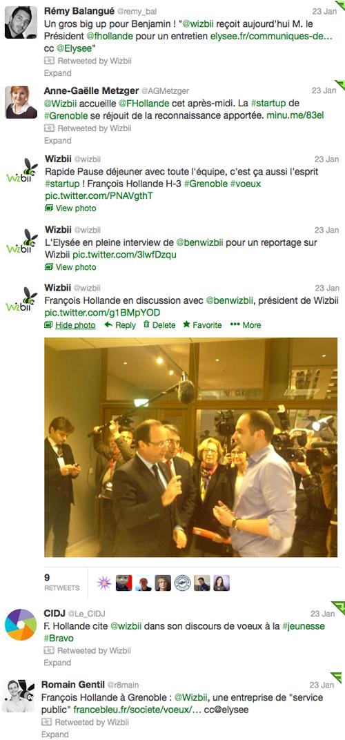 Mercredi 23 janvier 2013 a été un grand jour pour la startup grenobloise Wizbii. A l'occasion de sa venue dans la ville de Grenoble pour présenter ses vœux à la jeunesse, le Président François Hollande a sélectionné Wizbii comme start-up à découvrir. Récit par Sophie Lebel, Community Manager de Wizbii.