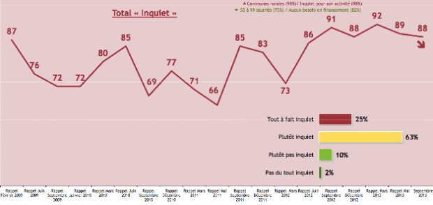 En ce qui concerne la situation économique, malgré une baisse significative de 4 points par rapport à l'enquête de mars 2013 (traitée par la rédaction), on observe une tendance d'inquiétude relativement stable depuis juin 2012 (oscillation entre 86 et 92% d'inquiets). Parmi les plus confiants, seulement 2% se déclarent "Pas du tout inquiets" et 10% "Plutôt pas inquiets".