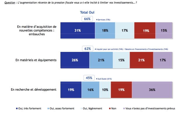 Combiné avec la pression fiscale grandissante, le durcissement des conditions de financement conduit inévitablement à une réduction des investissements en matière d'embauches (pour 66% des sondés), de matériels et équipements (62%), et de R&D (45%).