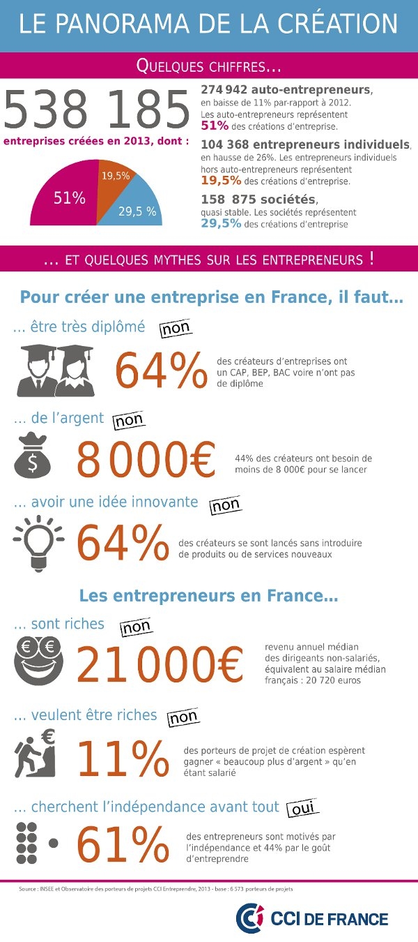 CCI France (l'assemblée des Chambres Françaises de Commerce et d'Industrie), l'établissement national fédérateur des CCI, vient de diffuser une infographie qui dresse un panorama de la création d'entreprises en France. Un bilan qui veut aussi tordre le cou à certains préjugés qui demeurent toujours vivaces sur les entrepreneurs:[hr]
