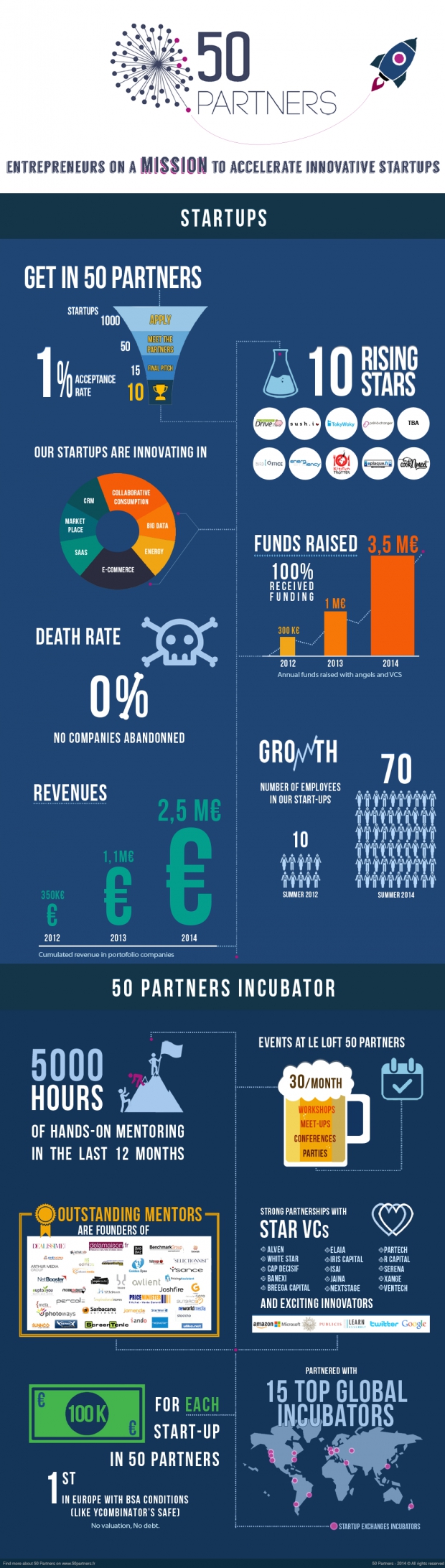 Outre l'annonce du lancement en Janvier 2014 de Startup Exchanges Program, l'Erasmus pour les startups, 50Partners avait annoncé en mars dernier, soutenir financièrement entre 50 000 et 150 000 euros toutes les jeunes boites souhaitent rejoindre son programme. Ce dispositif porte le nom de 50 Partners Capital et revendique être le premier financement d’amorçage systématique pour les projets d’un incubateur français (le modèle est calqué sur des structures anglo-saxonnes du type Y Combinator, Seedcamp et Techstars). Déjà 3 projets (Sush.io, Eplaque et BirdOffice) ont pu bénéficier de ce dispositif en mai et juin 2014.