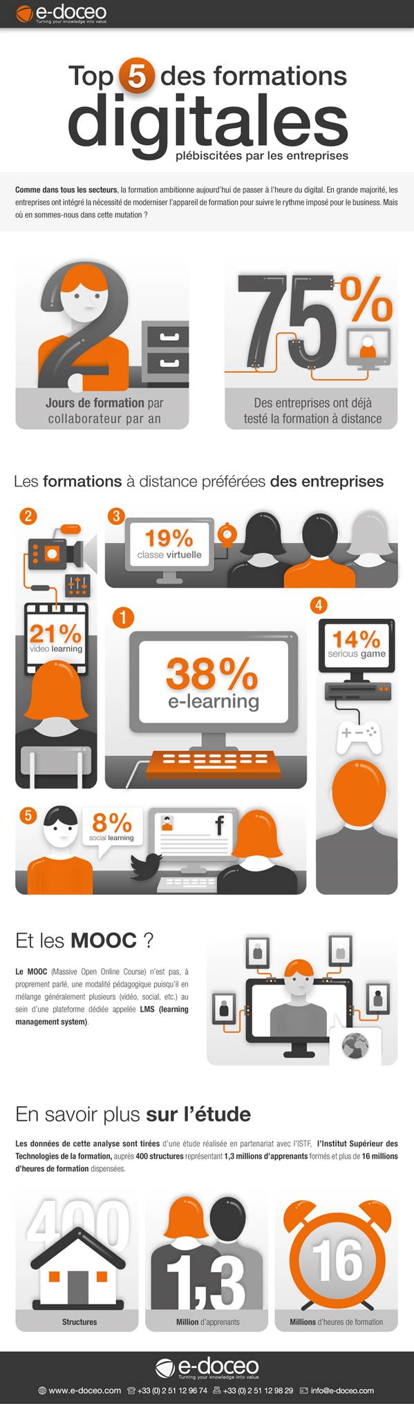 Leader sur le marché du e-learning en France et un des acteurs majeurs sur la scène internationale grâce à ses logiciels dédiés à la formation blended learning, e-doceo accompagne les entreprises de toutes tailles dans la valorisation de leurs connaissances et de leur capital humain au travers de leurs services. L'entreprise vient de dévoiler le top 5 des formations digitales plébiscitées par les entreprises, sous forme d’infographie. Maddyness vous propose de les découvrir.