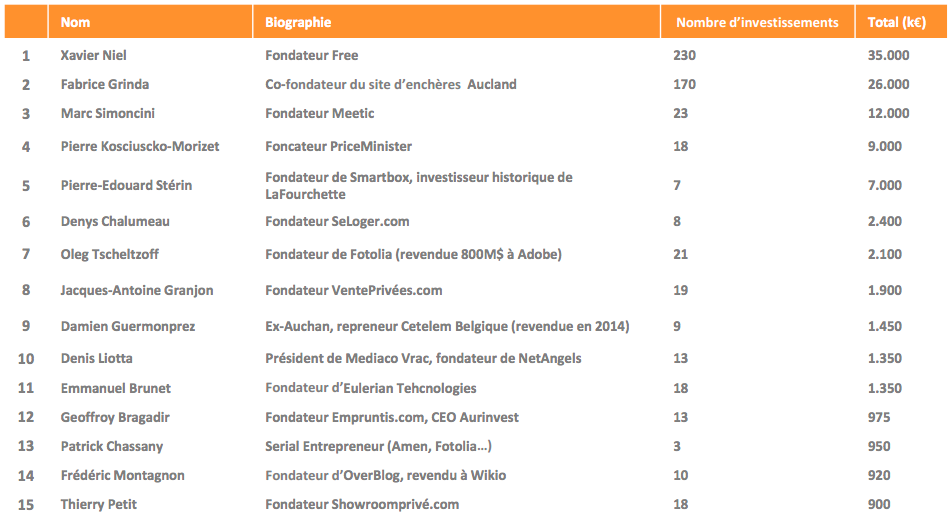Sur la base de 500 répondants, mais aussi de données externes issues de bases de données comme AngelList, ce classement n'affiche aucune surprise, tout au moins sur le podium. Xavier Niel est le premier investisseur de France avec 230 investissements pour 35 millions d'euros, devant Fabrice Grinda, qui a investi 26 millions d'euros pour 170 prises de participations. La troisième marche du podium est occupée par Marc Simoncini, qui totalise 23 investissements pour 12 millions d'euros.