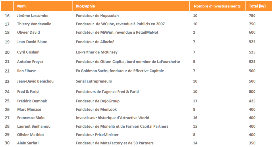 Ce podium reflète plusieurs choses : la première est la différence flagrante de montants et d'investissements entre les 2 premiers (230, 170) et le troisième (23). La seconde remarque est que la plupart de ces personnes sont d'anciens entrepreneurs, qui réinvestissent à leur tour dans les jeunes pousses. Pour illustrer ce propos, on peut notamment citer Denys Chalumeau fondateur de SeLoger.Com, s'affiche à 6ème place de ce classement (2,4 millions investis pour 8 projets soutenus), Thierry Petit, fondateur de Showroomprivé, Oleg Tscheltzoff, fondateur de Fotolia ou encore Jean-David Blanc, fondateur d'Allociné.
