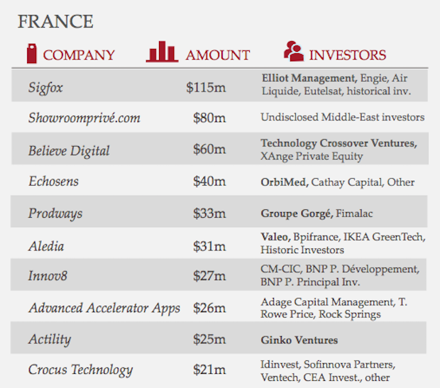 A la première place du podium : le Royaume-Uni, qui a engrangé plus d'1,8 milliard de dollars d'investissements. Une hausse de 74% due à l'émergence des "fintech", avec un trio de tête composé Funding Circle (150 millions de dollars), de Worldremit (100 millions) et de Verne Global (98 millions). La France, elle, se positionne numéro un en volume de transactions avec 159 transactions clôturées au premier semestre, contre 154 pour le Royaume-Uni et 81 pour la région DACH (Allemagne, Suisse et Autriche) et enregistre 1 milliard de fonds levés. Parmi les sociétés qui ont levé le plus de capitaux se trouvent : Sigfox avec 115 millions de dollars, showroomprive.com avec 80 millions et Believe Digital avec 60 millions.