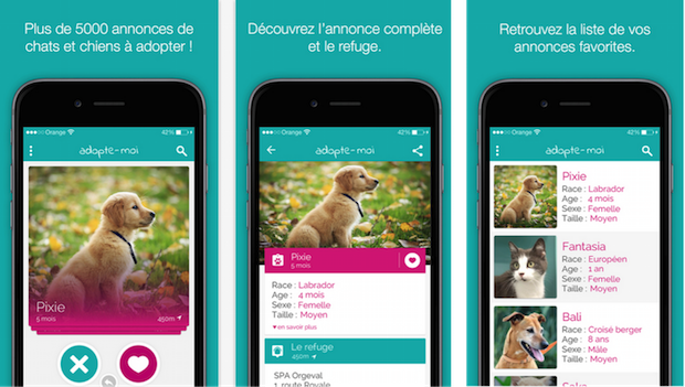 Adopte-moi est une application d'adoption de chiens et chats, avec un système de sélection façon Tinder. Gratuite, elle regroupe plus de 5 000 annonces en France où chaque animal dispose d’une fiche détaillée regroupant toutes les informations pratiques (description, photos, coordonnées du refuge, etc.). Toutes ces annonces proviennent des refuges de la SPA.