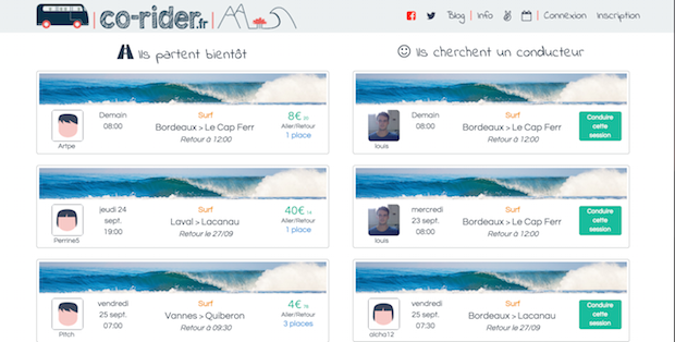 Co-rider, le Blablacar des surfers, permet de poster son prochain trajet en voiture jusqu'au spot de son choix et ainsi partager les frais de route entre passionnés de la glisse. Co-rider propose également des bons plans, tels que des réductions sur des cours de surf en montrant sa fiche en ligne.