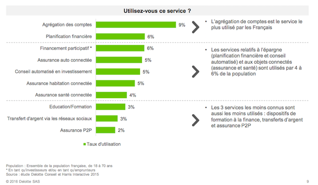 Et leur méconnaissance des FinTech est marquante. Seulement 9% des interrogés déclarent ainsi utiliser un service d’agrégation de comptes. C’est plus que les 9 autres offres FinTech listées par l’étude, qui ne sont en majorité utilisés que par 4 à 6% des français pour les services relatifs à l’épargne (financement participatif, planification financière, conseil automatisé) et aux objets connectés (assurance et santé). Les services de formation à la finance, de transferts d’argent et d’assurance P2P ne concernent quant à eux que 2 à 3% des Français.