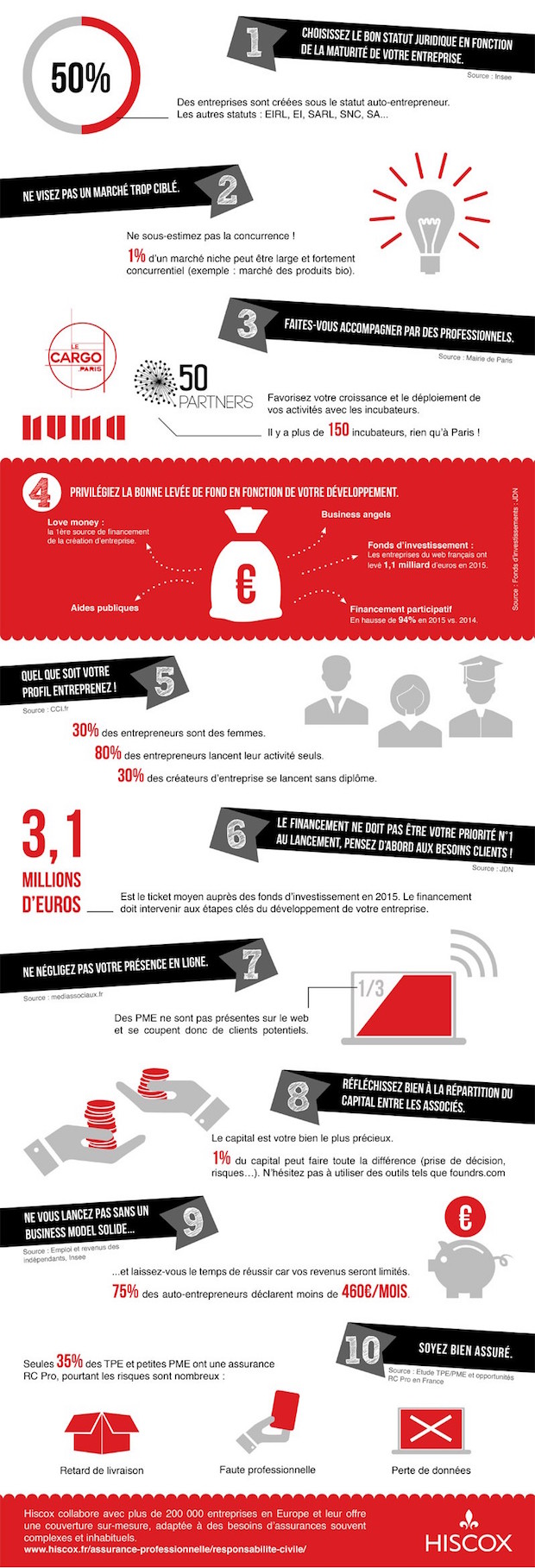 Dans ce contexte d’évolution constante, Hiscox vient de publier une infographie sur les bons réflexes à adopter pour entreprendre. Résumé en 10 points :