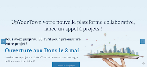La seconde, UpYourTown, est mise en place pour accélérer les processus d'amélioration de la ville, c'est à dire pour créer une ville intelligente, résiliente, frugale, post-carbone. Les différents projets présents sur la plateforme de crowdfunding pourront ainsi traiter d'urbanisme, d'aménagement, de transport ou encore de loisirs, soit autant de sujets actifs dans le processus d'évolution de la ville.