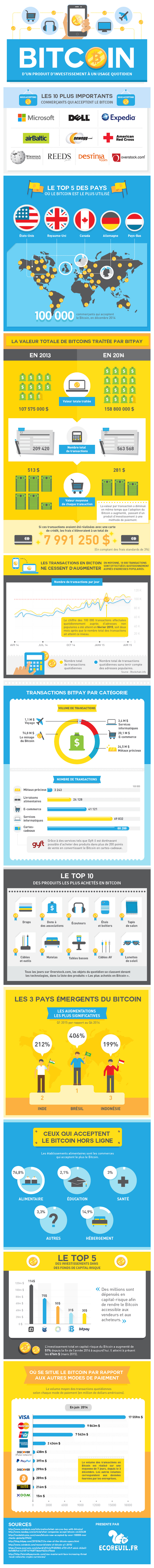 Combien de commerçants acceptent aujourd'hui le Bitcoin ? Cette monnaie virtuelle obtient-elle les résultats escomptés ? Ou se situe la France sur ce marché ? Autant de questions auxquelles le spécialiste du couponing online Ecoreuil tente de répondre, dans une infographie dédiée au Bitcoin et à son usage au quotidien.