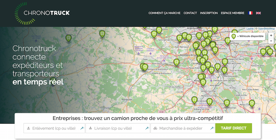 Chronotruck est une application web qui géolocalise les véhicules de transport de marchandises (TRM) et innove en donnant accès sur son site à la position des chauffeurs référencés. Lancé fin 2015, la jeune pousse a référencé plusieurs centaines de transporteurs professionnels et leurs chauffeurs. Chronotruck affiche ainsi sur sa home-page la position de tous les camions disponibles dans toute la France au moment de la consultation. Ce sont entre 100 et 300 chauffeurs qui apparaissent ainsi en permanence.