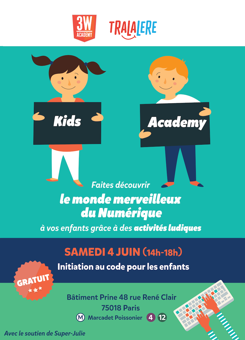 A travers l'événement « KidsAcademy », qui aura lieu le samedi 4 juin prochain, Tralalere et la 3W Academy feront découvrir le code aux enfants âgés de 7 à 13 ans grâce à des activités et des jeux ludiques issues du programme code-decode, un programme pour faire comprendre les fondamentaux du code et de la culture numérique dès le plus jeune âge.