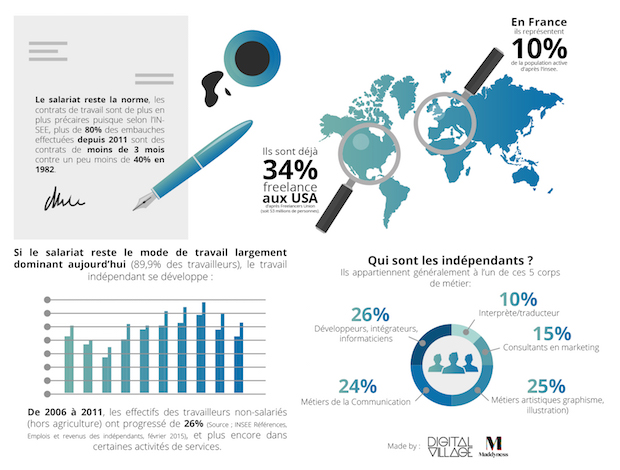Il n’est donc pas anormal de voir émerger, depuis plusieurs années, un nouveau mouvement structurel : l’essor du travail indépendant. En Europe, il y aurait ainsi près de 9 millions de freelances soit une augmentation de 45% entre 2000 et 2013. Aux Etats-Unis un travailleur sur trois est aujourd’hui indépendant. On en prévoit un sur deux dans 10 ans.