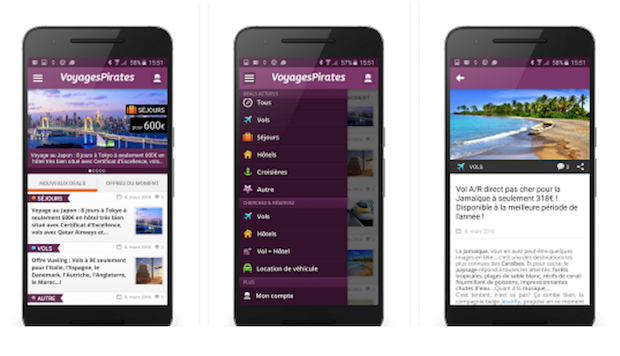 VoyagesPirates recense les meilleures offres, promotions, baisses ou erreurs de prix sur des séjours, vols, croisières, parcs de loisirs et autres transports. L'application permet également de programmer des alertes voyage personnalisées, et envoie un message à l'utilisateur dès que le voyage correspondant à ses attentes est disponible.