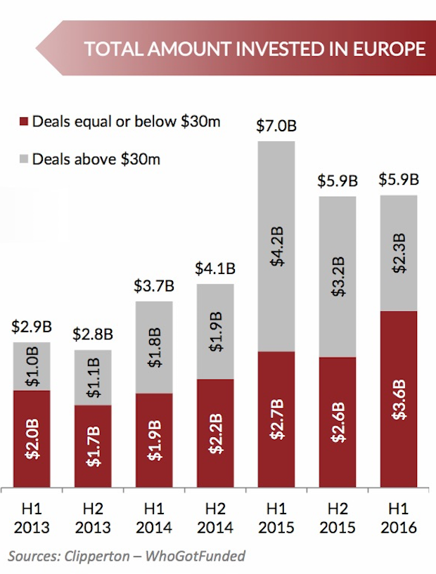 Au premier semestre 2016, le financement de l'innovation en Europe est resté plutôt stable avec plus de 630 transactions, pour un montant total de 5,9 milliards de dollars. Il faut toutefois noter un changement de tendance : là où les investissements de moins de 30 millions permettaient de gonfler le chiffre total, en 2016, les "petits" investissements ont gagné du terrain. Ces investissements de plus de 30 millions ont ainsi diminué de 45% en comparaison à la même période l'an passé. Depuis le début de l'année, les investissements de moins de 30 millions de dollars représentaient 60% du montant total.
