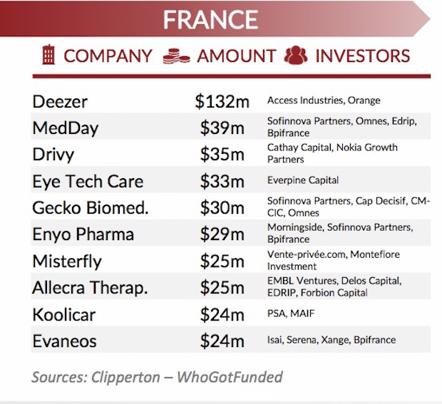 En France, la tendance est également bonne. On y dénombre plus de 200 transactions depuis le début de l'année, soit 30% de plus qu'au premier semestre 2015. La valeur des montants investis a elle aussi augmenté, pour atteindre 1,2 milliard de dollars. Le Français Deezer, concurrent de Spotify, a levé plus de 130 millions de dollars auprès d'Orange et d'Access Industries. C'est d'ailleurs l'unique société française ayant réussi à se frayer un chemin dans le classement des meilleurs investissements du secteur informatique. En seconde position, MedDay, startup spécialisée dans la détection de maladies neuro-métaboliques, a elle levé 39 millions de dollars. On retrouve sur ce podium Drivy (35 millions de dollars) aux coté s de son concurrent Koolicar qui a lui levé 24 millions de dollars et de nombreuses BioTech comme Eye Tech Care (33 millions de dollars), Gecko Biomed (30 millions de dollars), ou encore Enyo Pharma (29 millions de dollars).