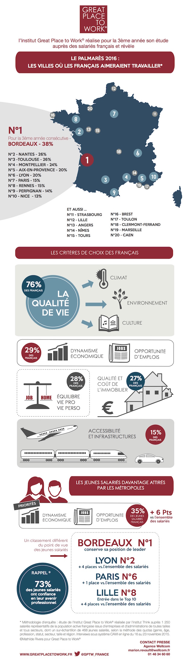 L'institut Great Place To Work révèle son classement 2016 des villes où les Français aimeraient travailler. Pour la troisième année consécutive, Bordeaux garde la tête du classement. Découvrez le palmarès des villes de France où il fait bon travailler.