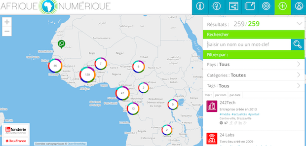 Afrique Numérique recense 19 pays ayant pour langue officielle le français. Ils sont répertoriés en 6 catégories d'acteurs : incubateurs, entreprises, écoles, investisseurs, tiers-lieux et communautés.