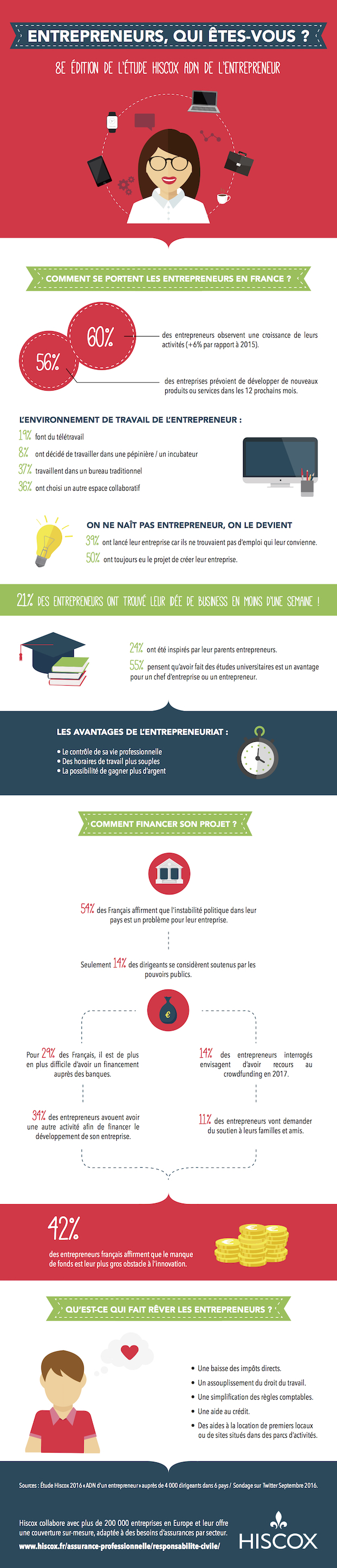 Pour la huitième fois, Hiscox s'est penché sur ce qui faisait l'ADN de l'entrepreneur et en dresse le portrait : comment devient-on entrepreneur ? Comment financer sa startup ? Qu'est-ce qui fait rêver les entrepreneurs ? Les réponses en une infographie.