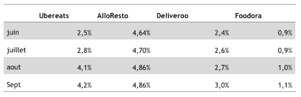 Le panel Inside voit exploser UberEats, qui atteint fin septembre 4,2% du panel, s’approchant à vive allure d’AlloResto, qui stagne juste en dessous des 5%. Deliveroo poursuit sa croissance très régulière, mais n’est bien que troisième. Foodora reste quatrième. Pour mémoire, Toktoktok était devant Foodora à 1,4% du panel, TakeEateEasy, lui pesait 2,64% du panel.