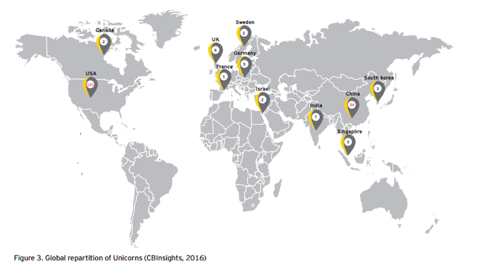 Il semble que le Vieux Continent soit en retard quant au nombre de licornes qu’il abrite. En valeur, l’écart avec les Américains est encore plus conséquent. Ainsi, la valorisation de toutes les licornes américaines s’élève à un quart de l’indice boursier français, le CAC 40. En septembre 2016, les GAFA présentaient une valorisation totale de 1 550 milliard de dollars, alors que la valeur du CAC40 était de 1 348 milliard de dollars. Les États-Unis ont crée plus de startups devenues licornes ou FPC que l’Europe, alors que ce dernier continent crée pourtant plus de startups. Le défi n'est donc pas tant de soutenir l'entrepreneuriat mais de réussir à créer des entreprises innovantes qui ont vocation à devenir des FPC, entreprises dont le potentiel est assez fort pour devenir des licornes.