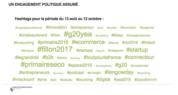 Enfin, on observe l'absence de réticence des startupers à faire valoir leur engagement politique. Durant la période de l'étude, on remarque que les hashtags #fillon2017 et #primaireeco ont eu de fortes occurrences. Mais François Fillon n'est pas le seul à nourrir les débats des dirigeants de jeunes pousses. Dans les tweets étudiés, Nicolas Sarkozy revenait à plusieurs reprises. Enfin, on notera l'absence d'Emmanuel Macron, pourtant habituellement associé à la French Tech. Mais les résultats auraient sûrement été tout autres si l'étude avait été réalisée cette semaine, largement occupée médiatiquement par le premier discours de l'ancien banquier affaires, désormais candidat à la présidentielle.