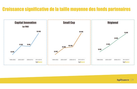 Le bilan que publie Bpifrance met en avant des transformations significatives de son activité. On remarque en premier point que la taille moyenne des 321 fonds partenaires, dont 106 régionaux, a considérablement augmentée. Ainsi, en Capital Innovation, on passe de 78 millions d’euros pour la période 2008-2012 à 134 millions d’euros pour la période 2013 - 2015. L'investissement en Small Cap a lui augmenté de près de 100%, passant de 102 millions d’euros entre 2008-2012 à 191 millions d’euros pour la période 2013-2015. Enfin, les 106 fonds régionaux ne sont pas en reste et atteignent 34 millions entre 2013 et 2015 contre 28 millions sur la période 2008-2012.