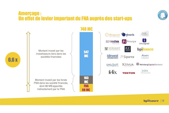 Lancé en 2009, le Fonds National d'Amorçage ne finance pas directement des entreprises mais investit dans des fonds d'amorçage. Les équipes de gestion se chargent ensuite de réaliser des investissements dans de jeunes pousses innovantes en phases d'amorçage et de démarrage. 21 fonds ont été souscrits, dont 7 inter-régionaux, pour un total de 815 millions d'euros. Le FNA a investi 399 millions d'euros, dont 142 millions dans des fonds inter-régionaux. Ce sont ainsi pas moins de 274 sociétés qui ont été financées. Les investissements réalisés par le FNA sont en majorité situés dans le secteur des TIC, à hauteur de 49%. Les sciences de la vie représentent 35% du total et les technologies propres 16%.