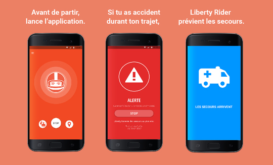 Comment ça marche ? Il suffit de lancer l'application Liberty Rider à chaque fois que l'on part en moto. Il est possible de partager son trajet en direct avec des amis. Si malheureusement un accident survient, l'application va faire sonner le téléphone de l'utilisateur. Il peut arrêter l'alerte si il y a plus de peur que de mal. Si l'utilisateur n'est pas en mesure d'arrêter l'alerte, un signal est envoyé au centre de Liberty Rider, qui sera capable d'analyser les données pour appeler les secours.