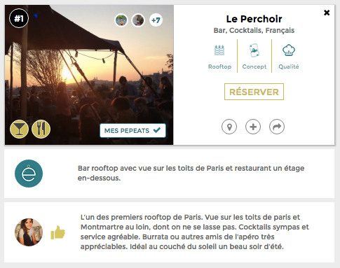 Envie de calme ou d'un grand espace pour venir en groupe ? L'utilisateur peut trier facilement ses Pepeats grâce à des filtres : meilleur moment de la journée pour s'y rendre, raison d'y aller (patron sympa, rooftop stylé...) ou ambiance (convivial, cosy, romantique, branché...). L'utilisateur peut également ajouter un commentaire, un avis ou une raison pour y aller. Grâce au fil d'actualité, il se rend compte des derniers lieux à découvrir et des utilisateurs à suivre pour s'inspirer.