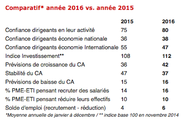 Premier constat : Les niveaux de confiance, d'investissement, d'activité et d'emploi des dirigeants ont été au vert en 2016, malgré une grande instabilité tout au long de l'année. C'est ainsi que 80 % des dirigeants se sont déclarés confiants pour l'activité de leur entreprise, contre 75% un an plus tôt.