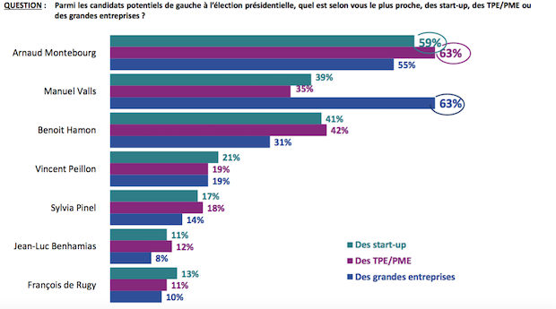Et à ce niveau, c'est Arnaud Montebourg, arrivé troisième du premier tour de la primaire de gauche, qui était considéré comme le candidat le plus proche des entreprises, startups et PME/TPE comprises (respectivement 40% et 42% des Français). Manuel Valls, deuxième dans chacun de ces cas de figure, se hisse nettement en tête auprès des grandes entreprises puisque 51% des Français le placent en premier.