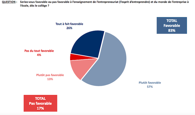 La plupart des Français sont en effet aujourd'hui demandeurs de plusieurs mesures liées à l'entrepreneuriat, à commencer par l’enseignement de l’entrepreneuriat à l’école (83% des Français y sont favorables), et par la création d'une assurance chômage automatique pour les créateurs d'entreprises (85% de personnes interrogées favorables).