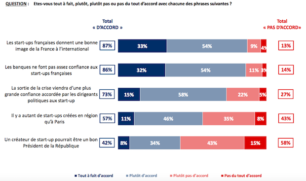 Et si la plupart des Français estiment ainsi que le modèle développé par les jeunes entreprises françaises pourrait être un exemple pour la classe politique, seulement un Français sur trois pense en revanche que ce sont elles qui créent le plus d’emplois en France. Dans cette logique, 42% des personnes interrogées estiment qu’un créateur de startup pourrait être un bon Président de la République, score en baisse depuis le dernier baromètre publié en novembre dernier, dans lequel 68% des sondés considéraient qu’un entrepreneur pouvait tenir ce rôle.
