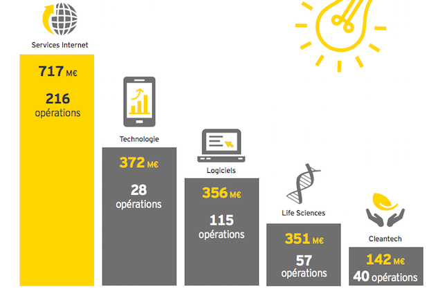 Sans surprise, ce sont toujours les secteurs des services internet, logiciels et technologie qui font toujours la course en tête, à la fois en matière de montants levés et de nombre d’opérations. Selon EY, les services internet, avec un montant de 717 millions d’euros levés pour 216 opérations, concentrent ainsi 33% des investissements à eux-seuls, alors que celui des technologies profite quant à lui des impressionnants tours de tables de Sigfox (150 millions d'euros) et Devialet (100 millions d’euros) pour revendiquer une hausse de 35% des investissements en 2016.