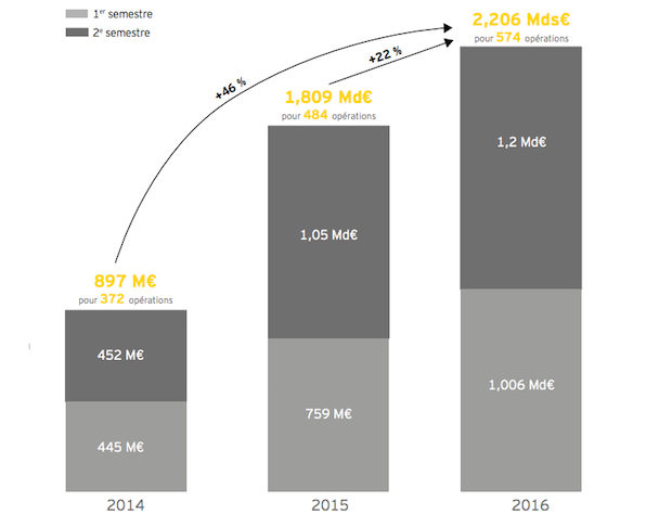 Comment se porte le capital risque français ? Toujours aussi bien, à en croire les deux derniers baromètres publiés respectivement par EY et KPMG. Alors que Maddyness vous annonçait début janvier un nouveau record pour les startups françaises avec plus de 2 milliards d'euros levés sur l'année 2016, EY confirme dans son baromètre du capital risque en annonçant 2,206 milliards d'euros levés pour 574 opérations, avec un montant moyen de 3,8 millions d’euros par opération.