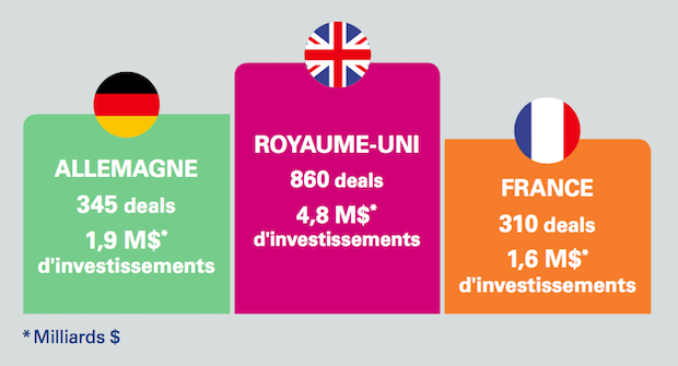 Malgré une baisse globale des investissements, le Royaume-Uni, conserve la tête des pays européens, et comptabilise 36% du total des montants levés et 24% du nombre total des opérations, notamment grâce à une très forte accélération lors du dernier quart de l’année 2016. Avec 4,8 milliards de dollars d'investissements pour 860 deals , il devance l'Allemagne (345 deals / 1,9 milliard de dollars d'investissements) et la France (310 deals / pour 1,6 milliard de dollars d'investissements selon KPMG).