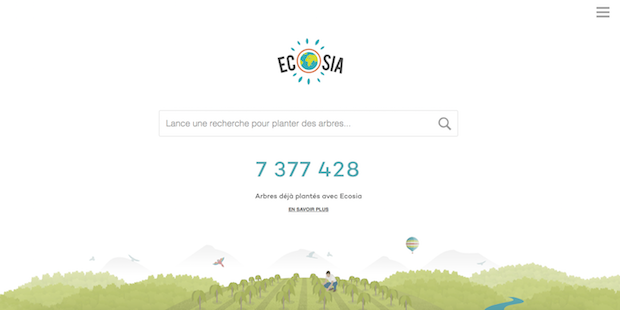 Ecosia est un moteur de recherche à impact environnemental positif. Pendant qu'un internaute est sur internet, il s'occupe de planter des arbres dans des zones où l'écosystème est fragilisé, grâce aux recettes publicitaires générées par les recherches. Une icône en haut à droite indique même le total d'arbres que l'utilisateur a aidé à planter.