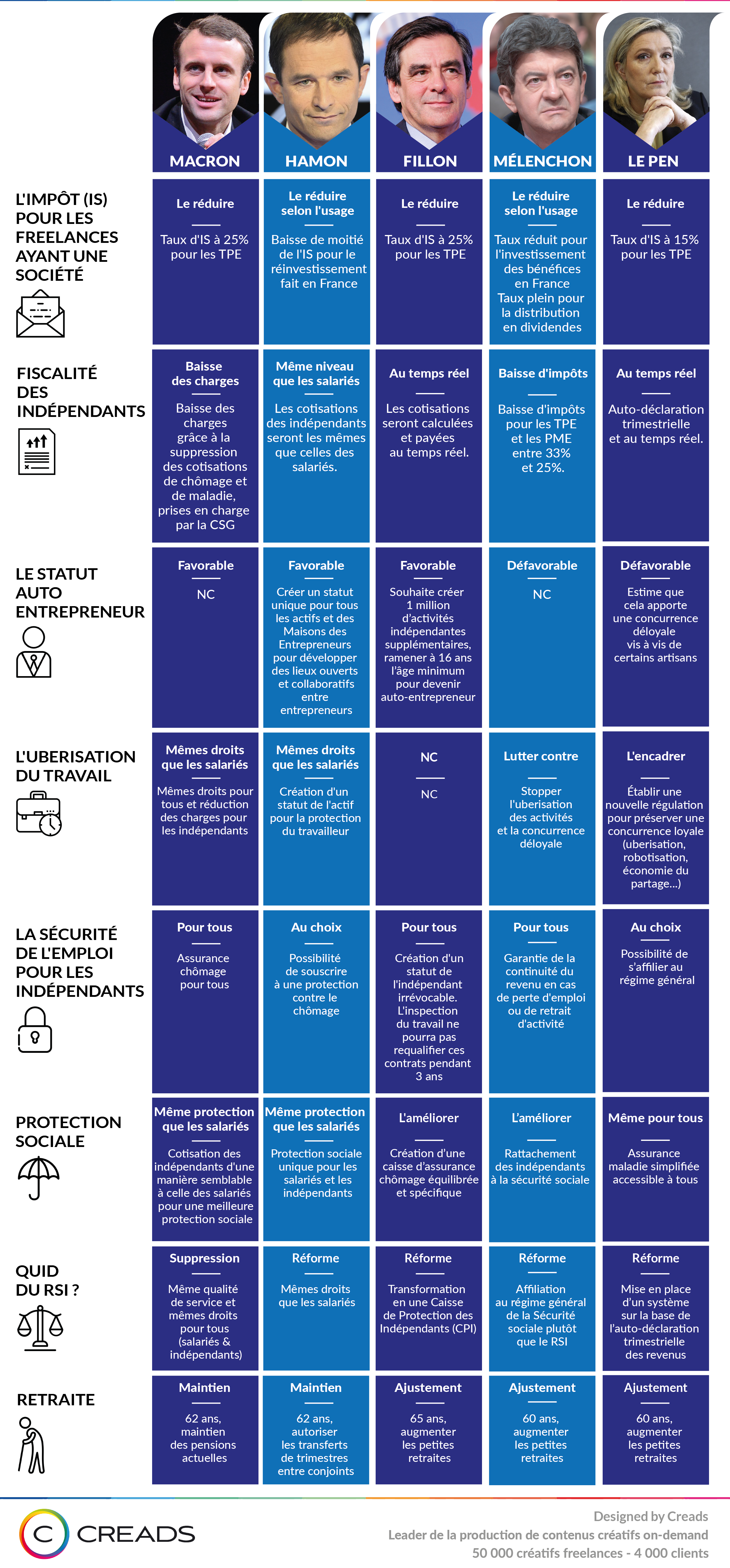 À l'avant-veille du premier tour, la plateforme Creads publie une infographie comparative des propositions adressées aux freelances des principaux candidats à la présidentielle.