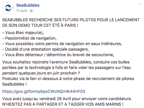 La startup SeaBubbles vient de boucler une nouvelle levée de fonds pour perfectionner ses bulles flottant à quelques centimètres au-dessus de l'eau. L'occasion pour certains de toucher du doigt un rêve d'enfant : et si vous deveniez pilote de bateau volant ? Début avril, la jeune pousse annonçait rechercher de futurs pilotes et donnait quelques pistes sur les compétences requises. Indice : pas besoin d'un diplôme en transports du futur ni d'être un as du volant numérique.