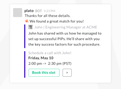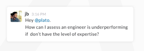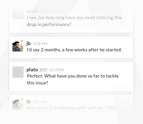Mais les outils existants d'aide au management sont "soit obsolètes, à l'instar des Mooc, soit trop chers, comme le coaching personnel qui peut coûter jusqu'à 300 dollars de l'heure (environ 275 euros) dans la Silicon Valley". C'est pourquoi Plato a imaginé une solution intégrée à Slack qui permet aux managers en quête de conseils d'entrer en relation avec d'autres managers plus expérimentés. Pour 199 dollars par mois (environ 180 euros), les premiers ont accès à un fil de discussion avec Plato, auquel ils expliquent leur problème.