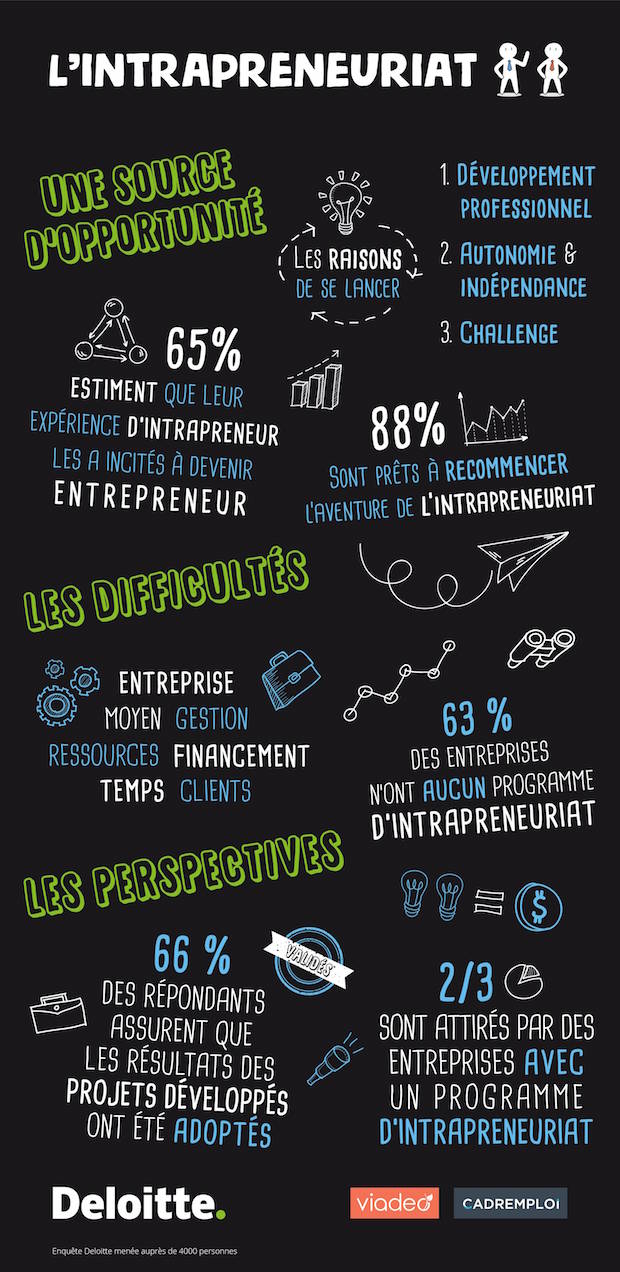 Développé depuis une trentaine d'années, l'intrapreneuriat ne compte, aujourd'hui, que 37% d'entreprises françaises y ayant eu recours. Pourtant, l'avantage d'un tel programme est considérable pour les sociétés, confrontées à la difficulté de recruter durablement de bons profils, eux-même à la recherche d'émancipation et de projets entrepreneuriaux (jeune diplômé sur deux souhaite se lancer en tant qu’entrepreneur afin de laisser exprimer sa créativité et son désir de construire son propre projet). Un constat sur lequel le Cabinet Deloitte s'est appuyé pour lancer, en partenariat avec Viadeo et Cadremploi , une étude baptisée : "L'intrapreneuriat : Effet de mode ou vague de fond ?".