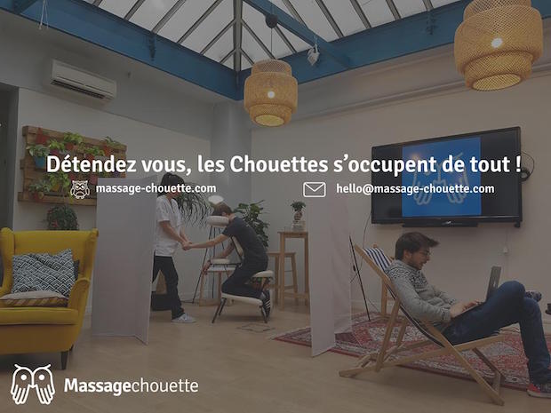 Lancée en novembre 2016, Massage Chouette souhaite transformer les espaces de travail en espaces où le bien-être règne. Des jeunes praticiens en kinésithérapie et ostéopathie interviennent au sein des entreprises pour proposer des massages sur chaise. Après une bonne séance de sport, le salarié peut ainsi se détendre et dénouer ses muscles. Quinze minutes sont dédiées pour chaque salarié afin de réduire le stress au travail.