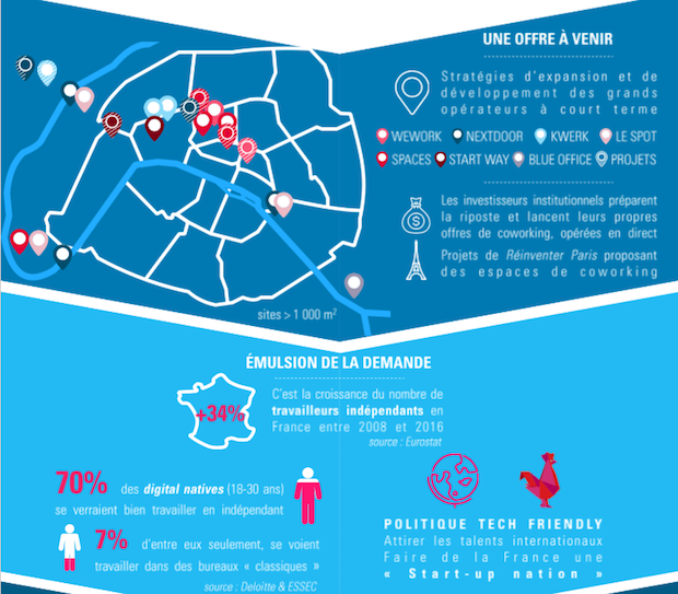 Ainsi, on a assisté, en seulement deux ans, à un bond de 167% des espaces de coworking, seulement sur la région parisienne. Plus impressionnant encore, le nombre d'espaces de coworking a été multiplié par 9 en Ile-de-France entre 2012 et 2017, passant de 20 à 177. En effet, la croissance impressionnante de ces lieux s'explique par l'engouement des startups et des freelances pour les nouvelles formes de travail, plus collaboratives: seulement 7% des digital natives (18-30 ans) se verraient ainsi aujourd'hui travailler dans un bureau classique.
