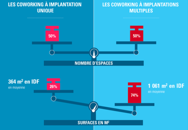 En effet, les espaces de coworking indépendants se révèlent moins onéreux puisqu'ils tournent autour du prix moyen de 401 euros pour un poste résident alors que les espaces de coworking qui proposent plusieurs sites comme Wework - un nouvel espace prévu d'ici cet automne - ont un coût moyen de 493 euros par mois. En revanche, l'infographie révèle qu'il y a autant d'espaces uniques de coworking que d'espaces multiples mais que leurs différences bien qu'elles résident dans le prix, se remarquent aussi dans la superficie bien plus grande dans les lieux de coworking multiples qui sont les grands acteurs du secteur comme Nextdoor, Kwerk et bien d'autres.