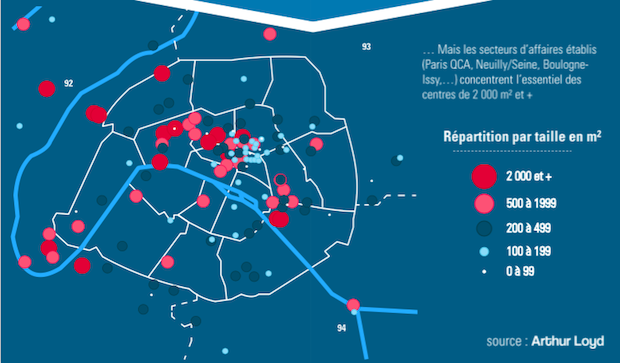 En revanche, on constate que les plus grands espaces de coworking qui dépassent les 2000m2 se cantonnent aux lieux classiques des secteurs d'affaires comme Paris Opéra, Haussmann, Gare de Lyon, La Défense, Neuilly-sur-Seine ou encore Boulogne et Issy-les-Moulineaux.